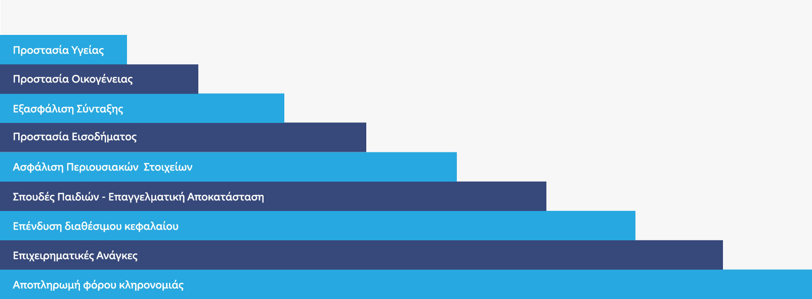 Μοναδικός σκοπός μας είναι να προτείνουμε τις καλύτερες και ποιοτικότερες ασφαλιστικές λύσεις στους πελάτες μας, προσαρμοσμένες στις οικονομικές τους δυνατότητες και απαιτήσεις. Μαζί αναπτύσσουμε ένα «πλάνο Ζωής δια βίου» με έγκυρη και έγκαιρη αναθεώρηση των οικονομικών κινδύνων που αφορούν: